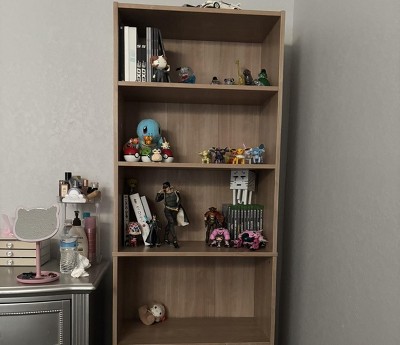 - Wood-finish bookcase offers a chic way to organize your favorite books and other items