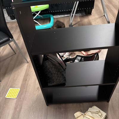 I bought 2 in the color black to use as a make shift entertainment center look. I contact papered the back of the shelves for a high end floral look. I gave 4 stars because they are wobbly on carpet, they’d probably be less on a hard floor. I’m going to attach a safety line rigged up with the wall mount they provide since mine are not up against the wall. I wish they came with 1 more shelf but my husband and I like them a lot. They are a great cheap,when you’re on a budget, way to make an entertainment center. My husband put them together in about 30 minutes each while I papered the back panels. I definitely recommend if you don’t have thousands or even hundreds to spend on shelves. They work best on hard floors, I don’t recommend for carpet even though I’m going to make it work. Wish the bottom was flat and not tiny side legs.