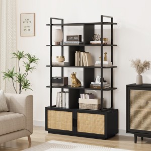 5 Tier Rattan Bookshelf with Storage Cabinet & Door, 71.1 Inch Tall Industrial Book Shelf,5 Shelf Bookcase with Metal Frame-Black