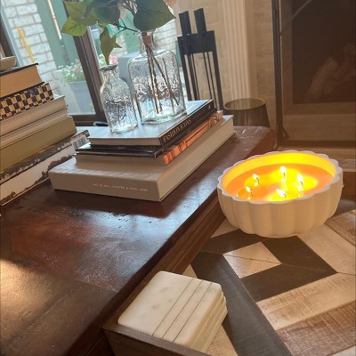 Such a gorgeous statement candle and smells amazing in the living room! It gives off a lot of light too in the dark. The only downfall is it is easily scuffed. I used a magic eraser sponge on all the marks and it’s good as new! Keep one of those on hand to keep it clean and white.