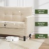 1. Premium Linen Upholstery This mid-century modern loveseat features premium grey linen fabric¡ªsoft, durable, and stain/fade-resistant. Its elegant lines and textured finish enhance retro aesthetics, especially when paired with green tones. A stylish, tactile addition to any space. 2. Extra-Deep Seat & Spring Cushions 20.9" extra-deep seat with spring packs and 18.9" backrest height offer optimal lumbar support. 6.7" thick cushions provide cloud-like comfort, while springs prevent sagging and extend lifespan¡ªperfect for unwinding after long days. 3. Ergonomic Armrests Designed for comfort, these armrests offer sturdy support for relaxed seating. The ergonomic design blends style and coziness, making this loveseat an essential rest spot for daily relaxation. 4. Sturdy Solid Wood Frame Crafted from premium solid wood (800 lbs capacity), this loveseat suits daily use¡ªnapping, reading, or coffee-snuggling. Compact design fits small spaces (bedrooms, dorms, apartments), with non-slip leg pads to protect floors. 5. Tool-Free Assembly Two-person setup in 10 mins¡ªno tools needed. Note: cushions arrive compressed; allow 24-48 hrs to fluff (patting helps). Unpack carefully to avoid scratches.