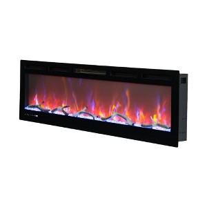Highlights at a Glance:- Recessed in-wall mounting for a sleek and modern look.- Faux-fire logs and crystals, as well as realistic flames for an authentic fireplace feel.- 5 adjustable flame sizes and speeds provide a customizable heating experience.- Lifelike flame effect with LED lighting offers 12 different flame styles and 13 ember bed colors.- 3 sound options allow you to hear a gentle crackling sound.- Operates at a noise level of ≤ 36 dB for a quiet environment.- Multiple control methods available: touch panel, remote control, Alexa compatibility, and a smart mobile app.- Built-in overheating protection prevents damage from excessive heat.- Child lock function ensures safety and prevents accidental adjustments.- 0.5-12 hour timer allows you to heat the space only when needed.