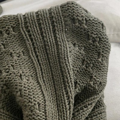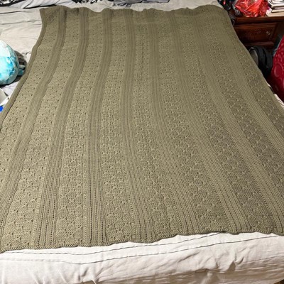 [This review was collected as part of a promotion.] I purchased this dimensional knit throw blanket and I really love it! The quality is very nice- you can tell it is really well made. The knit pattern is so pretty and the green color is muted but very nice. It measures about 60 inches long by 50 inches wide which is perfect. I like the way it looks draped over my chair, or also laid across my bed. Beautiful throw, would recommend.