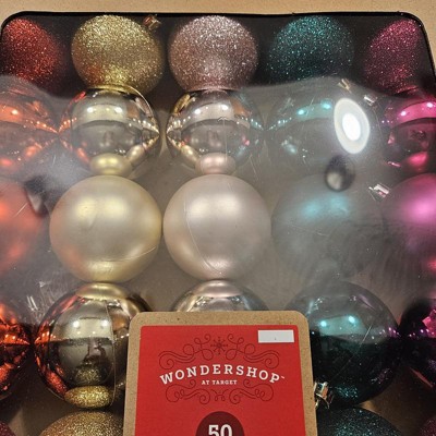 Bring a splash of festive sparkle to your tree with this 50-Count Christmas Tree Ornament Set from Wondershop™. Made of plastic, this ornament set features 50 ball ornaments in assorted pink shades and finishes for a lively pop of color. Each ornament has a silver-tone cap with a coordinating top loop for easy hanging, and the shatter-resistant construction is ideal for homes with pets or young kids.