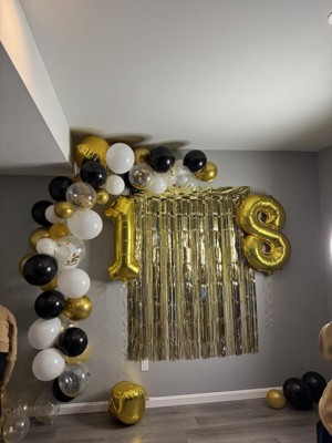 A: Hi Ky - Thank you for the inquiry. Decorate like a pro with the 52ct Large Balloons Arch with Backdrop Gold/Black - Spritz. Following the latest party trend, this set includes illustrated instructions to build out a feature backdrop with a metallic fringe curtain and balloon arch. Hope this helps! - Kris