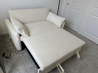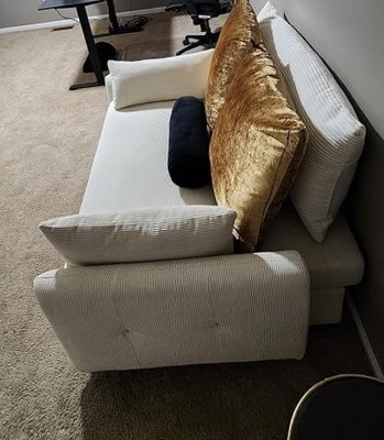 Since there aren't many reviews, I wanted to share our experience with this sofa bed so others could get a feel for it. I'd been looking for a small sofa bed that wasn't tweed, leather, or velvet, and this was exactly what I needed. It was a little more than I'd originally budgeted, but I took the plunge and am so glad I did! I chose the beige color, and the beautiful beige corduroy fabric is just as pictured and doesn't feel flimsy at all, so I'm sure it will last a long time. The cushions are a little firm, but I think that's better than being too soft. I prefer firm cushions because too soft can cause back pain. The trundle bed easily pulls out, even on carpet. The dimensions listed in the description are accurate. Overall, I'm very happy with this sofa bed! I hope this review helps you decide if it's right for you!