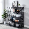 This bookcase is for those who like to color outside the lines. Its design pushes limits and forces one to appreciate imperfect outlines. The furniture piece's frame exposes the angled accents to create a dynamic image. Intricate black metal crossing posts form an hourglass shape. With a construction like this, the shelves contribute to and are highlighted by the fun frame. Sleek tempered glass black shelves cause display items to be reflected.
