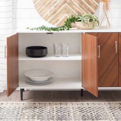 Made with warp-resistant MDF wood core finished with durable laminate finishPowder-coated steel hardware4 cabinet doors with faux bookmatch detailing2 fixed shelves for extra storageIntriguing two-tone finishAdjustable rubber feet for stabilityWeight capacities: Top surface 100 lbs., adjustable shelves 30 lbs. eachAssembly is required