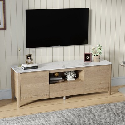 • Mix of Open and Hidden Compartments: The TV stand boasts open shelves ideal for a DVD player or cable box, complemented by spacious cabinets and full-extension drawers that offer generous storage for books and other items.