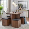 Modern and thoughtfully designed to maximize your dining space. The 5-piece Dining Set is perfect for a breakfast nook or small space living. Featuring a simple square silhouette with a base constructed to neatly fit the four ottoman chairs under the table, when they are not in use. Ottoman stools offer storage, a faux leather cushion top which can be removed and an attractive walnut finish.