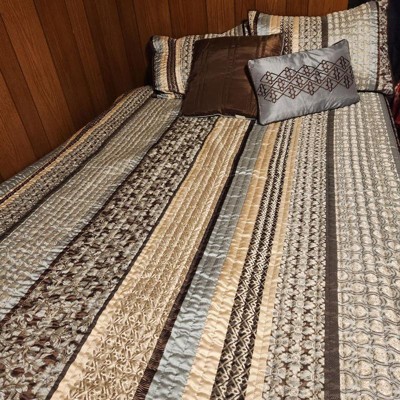 [This review was collected as part of a promotion.] I received this quilt set for free in exchange for an honest review. I'm in love with the colors and pattern of this quilt set. It looks very elegant, and the blue and brown tones complement each other beautifully. The quilt itself is a nice thickness. It's not too bulky like a comforter, but very warm. The quality is excellent and I like how the fabric has a satin sheen to it. I have a queen size bed and the queen/full size was a great fit. Upon receipt I washed, and steamed it a bit and it came out great. No color bleeding, no weird fill clumping. Now it looks so classy in my room!