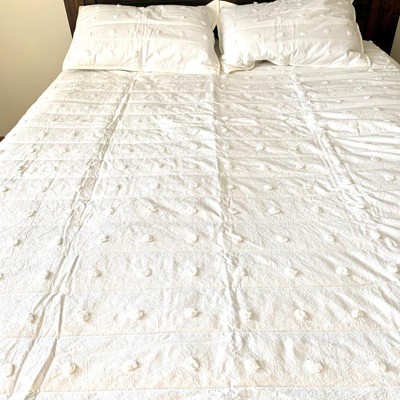 [This review was collected as part of a promotion.] I love this coverlet! The color is called ivory, but it is more like a warm white.The fabric is almost like a gauze texture with chenille dots on it. The tunnel quilting is very much en pointe. The set included a king size coverlet and two king size pillow shams. I use a king size coverlet on a queen bed because I like the sides a little longer. Anyways - I washed the set right out of the package in plain hot water and then dried them on low. They came out of the drier soft and unwrinkled.(and did not appear to have shrunk.) The seams are nice and straight, the stitching is tight and straight and the tunnel quilting is even. The edge binding is attached well without gaps. I really like this for it's boho look without being crazy It is a nice weight. Right now we have it over a down comforter, but as it warms up we will just use it with a top sheet. The color will allow you to use it in many different schemes and of course wallpapers. DD is eyeing it but she is not getting it as it is nice in our guest room.