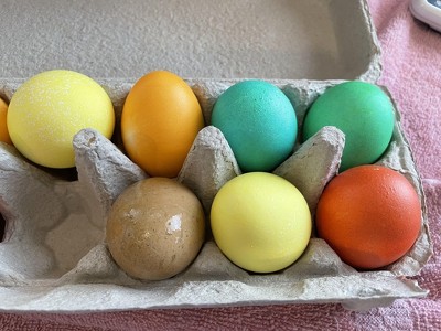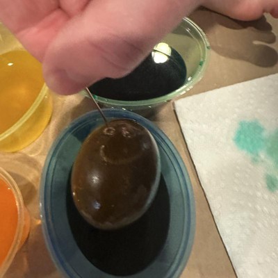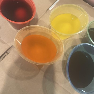 This egg kit was super disappointing. The colors are supposed to be blue, green, yellow, orange and red. What we ended up with was green, greener, yellow, orange and even more orange. We mixed blue and red to try for purple and we got brown. Vibrant hues, but yuck.