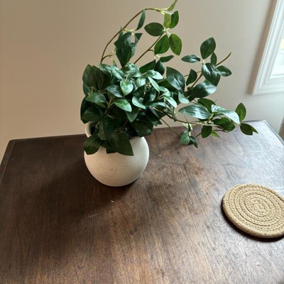 Review: This artificial plant looks surprisingly real a adds a nice touch of greenery without any maintenance. The trailing leaves fall natura and don't look stiff or fake. It's a good size for shelves or side tables and works well to fill empty corners and fire place . Simple, clean, and easy decor that instantly freshens up the space.