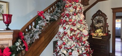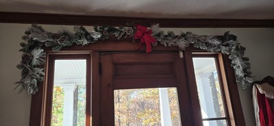 A: Yes, it features flocked mixed greenery and pinecones for a festive appearance.