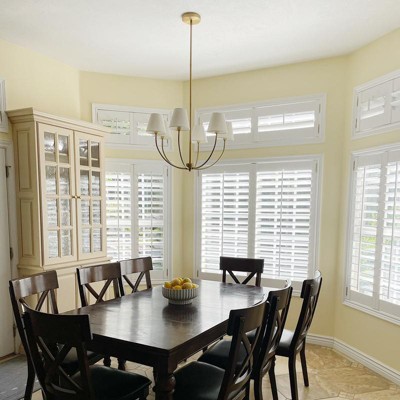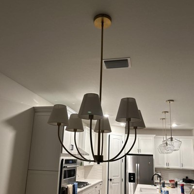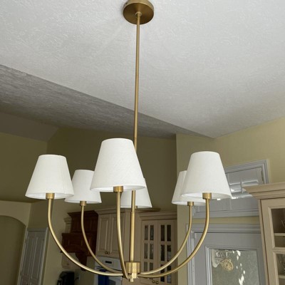 Put it in our kitchen for a change up from our old style chandelier. One of the arms is bent so I have to work on getting that straigtened out. The first time I ordered it, the bottom screw piece didn't sit all the way on, making the threading visible. Love the styling. Mix of traditional and modern. The shades are a nice off-white linen look. Not as white at the picture for sure.
