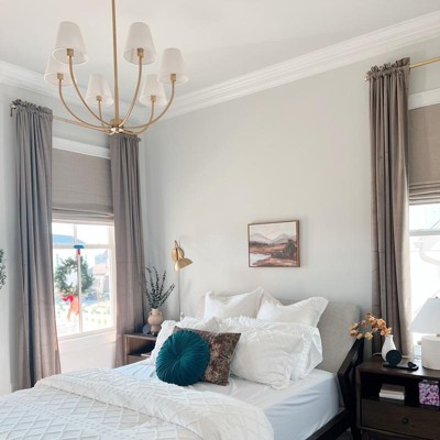 Pros: This chandelier is a cute, modern design with a nice brushed brass color (not super yellow gold). It’s not super heavy and was easy to install. Cons: one or two of the shades seemed a teensy bit crooked, as in not totally round at the bottom. And the wire pieces that hold the shades on the bulbs cast shadows on the shades. (The pic in the description with the chandelier illuminated is most definitely photoshopped.) The height of the chandelier can only be adjusted in 12” increments, just FYI, up to 48”. Still, for the price it’s pretty cute and it gives off lots of light. I bought it at 25% off, which is totally worth it at that price!