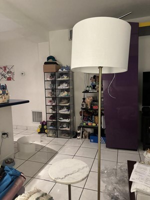 Light up your interiors while adding extra storage to your space with this Floor Lamp with Marble Table from Threshold™. This floor lamp features a white drum shade and a gold-tone metal body with a round pedestal base for a stylish look, and it also has a handy built-in marble table to help you organize your space. The drum shade gives off a soft glow for everyday use, while the 1-way light setting allows for easy operation. Place it next to your sofa in your living room, office or reading nook for practical illumination.