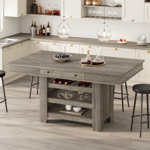 Elevate your dining experience with this beautifully crafted 60-inch counter-height table designed for both functionality and style. Standing at 36 inches tall, this table provides 15% more knee space than standard dining tables, ensuring comfortable seating and effortless chair storage. The intelligent design combines generous surface area with smart storage solutions including a deepened wine rack for secure bottle display, dual-tier shelving for organized glassware storage, and smooth-gliding drawers for utensil organization.Constructed from premium thickened MDF with reinforced structural bracing, this table supports up to 350 pounds with exceptional stability. The industrial-grade triangular leg supports and fortified joints eliminate wobble, making it perfect for daily family meals and entertaining. The versatile farmhouse design transitions seamlessly from dining table to home office desk, study workstation, or entertaining bar, adapting to various spaces including kitchens, living rooms, and studios.Assembly is simplified with numbered hardware and visual instructions, while the spill-resistant surface ensures easy maintenance. This table combines rustic charm with modern functionality, making it the perfect centerpiece for any home seeking both style and practical storage solutions.Key Features SummaryMaterial: Thickened High-Density MDFDimensions: 60"L x 36"H (Counter Height)Capacity: 350 lbs weight capacityFeatures: Wine rack, 2 drawers, dual shelvingSeating: Accommodates 4-6 peopleStyle: Rustic FarmhouseUse: Dining, home office, entertaining