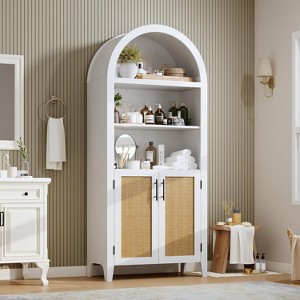 63.2" Tall Arched Bookcase with Doors, 5 Tier Open Display Shelf with Rattan Decor, Modern Bookshelf Storage Cabinet for Dining Room