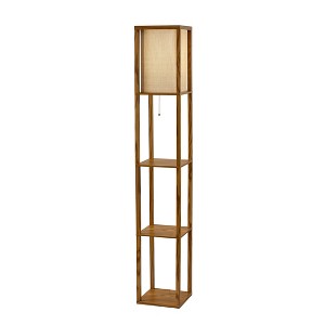 Have it all with style and multi-function. The Wright shelf floor lamp features a walnut wood finished open box frame with two additional display/storage shelves, making it a handy addition to the living/media room, den, office, or bedroom. The square natural textured shade diffuses light from a 150 Watt incandescent or equivalent bulb. The lamp has on/off functionality with a metal ball accented pull chain switch. This lamp has a clear cord and is smart outlet compatible. The lamp comes with clear wire clips for a clean look. Bulb is not included.