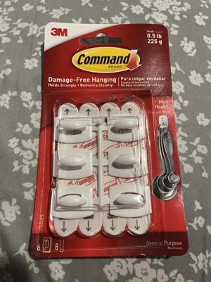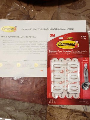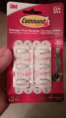 [This review was collected as part of a promotion.] I received a free sample of Command Mini Hooks to review. They come in a six pack, so you can hang multiple items per pack. The directions are clearly stated on the back of the package. I found them quick and easy to hang. It holds up to .5 pounds so it works nicely for many small items. I used them for measuring spoons inside my cupboard door. I would recommend these hooks.