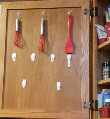 [This review was collected as part of a promotion.] I planned to use Command Mini White Hooks 17006ES to hang measuring cups and spoons with the spices and baking supplies by placing then inside the cupboard door. They were easy to install and worked on a few items, but the hooks were too wide to use with most of the measuring cups. For my personal use they would be better if the hooks were more narrow, especially since this is the mini size.