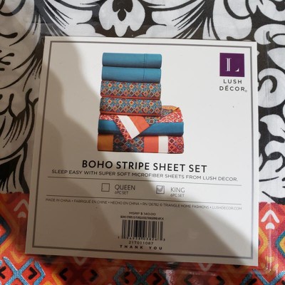 Lush Décor Queen 6pc Boho Stripe Patterned Sheet Set Turquoise/Tangerine: Microfiber, 225 Thread Count, Includes Pillowcases