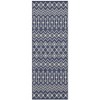 This indoor/outdoor area rug measures 7'10" x 10'3", in blue, offering modern elegance and practicality. Made from polypropylene yarn, it's durable for living rooms, patios, or decks. Kid and pet friendly, stain resistant.