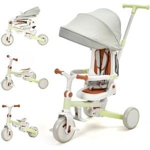 7-in-1 Foldable Baby Tricycle w/ Adjustable Parent Handle, Safety Harness & Wheel Brakes - Toddler Trike w/ Removable Canopy for Boys & Girls