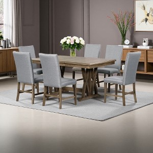 - MID-CENTURY SET FOR 6: The table features a retro trestle base and cross legs, blending elegance, charm, and functionality. It provides ample support and stability, withstanding heavy usage while maintaining a great look. The golden brown and gray color combination adds a vintage aesthetic, enhancing dining experiences and bringing sophistication to your home.