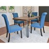 ELEGANT DESIGN HIGHLIGHTS: Rustic dark pine tabletop showcases natural wood grain for warm, inviting charm, with metallic hairpin legs adding modern industrial flair. Chairs stand out with button-tufted details (a touch of sophistication) and dark espresso legs that perfectly complement the table. Vibrant blue polyester upholstery creates a striking contrast, elevating the set’s overall elegance.