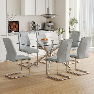 7-Piece Dining Set with Tempered Glass Table and 6 PU Armless Chairs