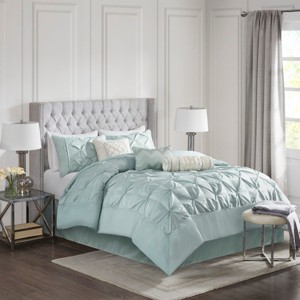 This beautifully tufted bed is from the Laurel bedding collection. Its seafoam coloring makes this set easy to accessorize in your bedroom. The collection is made from 100% polyester polyoni and has pieced fabric sewn together to give this set added dimension. It is finished with a smooth edge of fabric that creates a beautiful border around this comforter. Items in the set may come in a rolled or compressed packaging, which will need to be fluffed up or steam ironed before use to remove wrinkles.