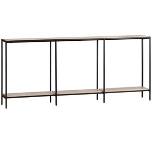 Features a narrow rectangular shape, making it ideal for compact spaces; Crafted from natural travertine and sturdy black iron for durability and style; The travertine top showcases unique veining, adding organic texture and sophistication; Includes a fixed lower shelf for additional display or storage needs; The black iron frame provides reliable support and stability; Designed for easy setup with simple assembly required; Due to inconsistencies of various monitors, handheld devices, lighting, digital photography, and variances that occur naturally in materials, the color you see on your screen may vary slightly from the products received.; This product has components made of natural materials which make it unique and can lead to slight color/size variations.
