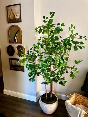This artificial ficus tree impresses guests with its realistic appearance and beautiful design, making it a perfect addition to any room. Many appreciate its sturdy pot and the ease of adjusting the branches for a fuller look. While some guests noted concerns about height and a few minor imperfections, the overall quality and aesthetic appeal have left a lasting positive impression. It's a great choice for those seeking a stylish and low-maintenance decor piece.