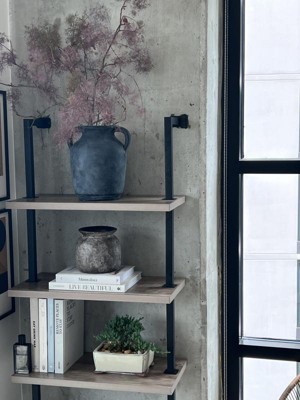 - The Theo Industrial Ladder Shelf is built with a durable metal frame and dry gray oak wood for an industrial farmhouse look.