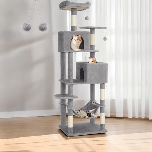 Designed for households with multiple cats, this 75.2-inch cat tower features two plush perches, two spacious caves, a hammock, and five scratching posts to support climbing, resting, and natural behaviors. Includes four pompoms (two with bells, two without) for interactive play and is reinforced with an anti-tip kit for safety. Easy to assemble with included tools and maintain with lint-roller friendly surfaces, it provides secure vertical exploration for cats up to 16 lbs each.