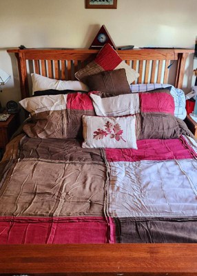 [This review was collected as part of a promotion.] This is a good quality comfort set with the style and color combinations I have been looking for, modern rustic. The color blocks are a good combination for many wall carpet colors. The accent pillows have different patterns on front and back so you can tailor it to your style or the season. The small pillow has a definitively fall oak leaf pattern that can be reversed out of season. Fit nicely on my tall queen mattress. Love it!