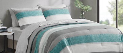 Madison Park Essentials Jaxon Stripe Comforter Set with Bed Sheets Twin Aqua/Grey Revamp your bedroom style with the Madison Park Essentials Jaxon bed in a bag. This modern comforter set features a stripe pattern in alternating grey, navy, and blue colors