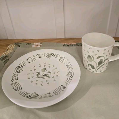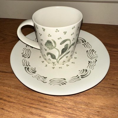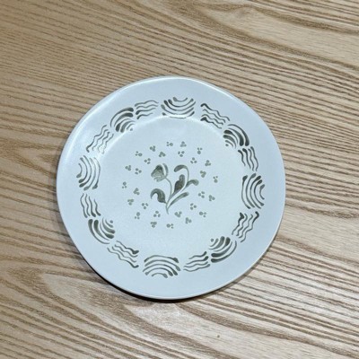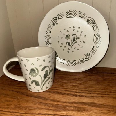 What a cute little plate. I love the white with the hand painted green design. It adds a perfect amount of color contrast for my dining room hutch. I was pleased with the size as I will use on a shelf in my hutch. If you are planning to use this for food it is dish washer and microwave safe. I love the matching mug with the plate as well.