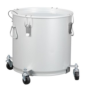 - Features: Locking lid, rubber gasket, wheels, filter bags, anti-rust coating