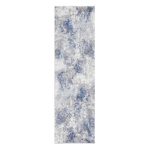 Add some artistry to your room with this 8-foot ivory blue and gray abstract runner rug. Built to last, this rug crafted from polyester fibers is known for its durability and long lasting appeal. Rugs are a great way to showcase your style, hide imperfections, warm your home and reduce noise. This rectangular shaped rug features a abstract design that will add a functional and decorative accent to your space. This modern style runner makes a great accent for the hallway, in front of cabinets, in the laundry room, or any other space you need a narrow and long rug. 30-inch h x 96-inch w x 0.4-inch d.