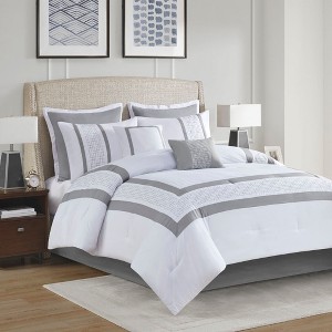 - Transitional, hotel style 8 piece comforter set in white and grey with embroidered and pieced details