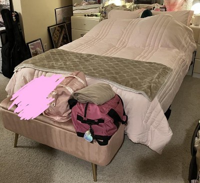 The color is a lovely pastel warm-toned pink, the comforter is fluffy, soft, big, and warm. Everything is true to size. The fitted sheet cover is thin and easy to put on so the only downside is I’m not sure how durable it’ll be but it dries quickly and has a handy side pocket for bedside supplies. The shams are cute as well. However the mattress cover is made of a plastic material that makes a lot of noise and feels stiff/not breathable so I won’t be using that.