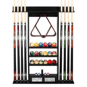 GSE Wooden Wall-Mounted Pool Cue Rack with Score Counter – Holds 8 Cues, Ball Rack, and Full Pool Ball Set (Black)