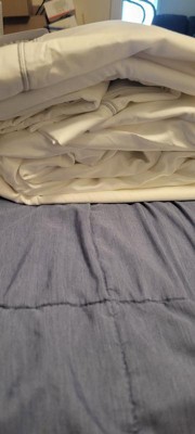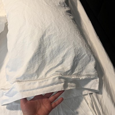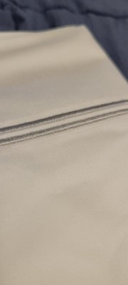 I did not look this up online, but rather I chose it in store. Apart from very fine print at the bottom of the UPC, there was no indication on the packaging of this set having a blue hem. Unfortunately, that doesn’t match my comforter or decor. I see now online that this comes with either a blue or grey hem, and I assumed it was all white. This is just a warning to check the UPC so you don’t end up with the wrong product. I did keep it because the store is 45 minutes away and I didn’t feel like going back. Otherwise, it is a bit heavier or thicker than a standard sheet set. It will wrinkle heavily after the first wash. It is advertised as a sateen sheet set but I am replacing a sateen set which never wrinkled and maintained its silky feel. This set feels like a standard hotel sheet after wash, not sateen at all, and more course than I’m used to. But it does seem that it’s made well.