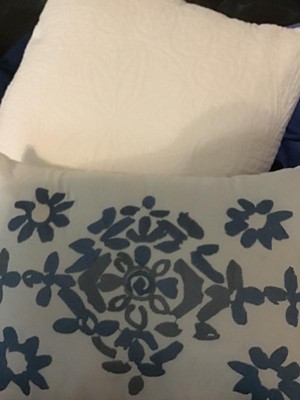 Gorgeous blue and white comforter set. I love the mix of colors for the comforter set. The darker blue is a nice contrast to the dusky grey/blue in the comforter and one set of pillow shams. The accent pillows have amazing texture and are really well made.