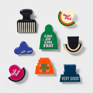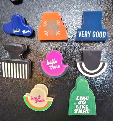 Add colorful organization to your kitchen with this Magnetic Bag Clip Set from Tabitha Brown for Target. This set includes eight clips in assorted colors and designs, featuring cheery phrases like "hello there" and "keep it fresh." Made from polypropylene, each clip features a magnetic back so you can attach them to your refrigerator or other metal surfaces for easy access. Use them to close back up your opened bags of snacks, chips, cereal and more to help keep food fresh.