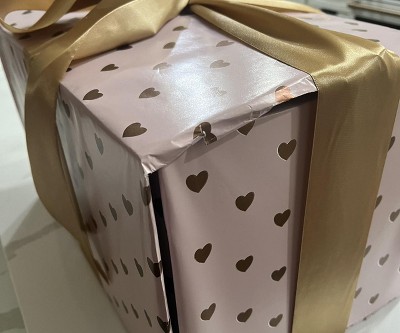 A: The wrapping paper features rose gold foil hearts as decorative elements.